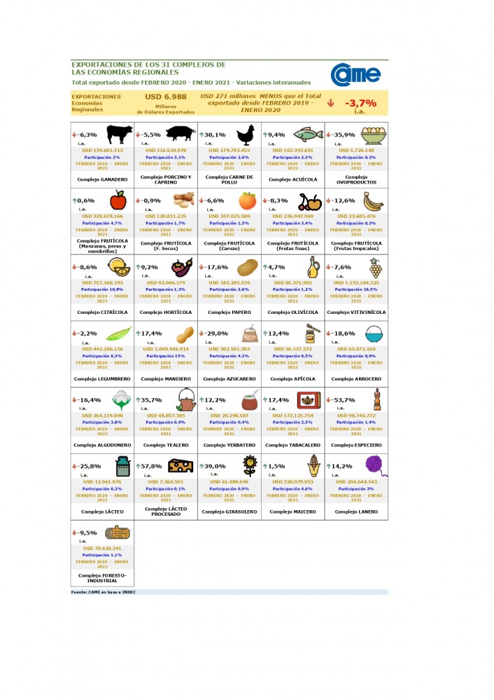 Los monitores de exportación de los 31 complejos de las Economías Regionales analizan la variación interanual de las exportaciones de la canasta. Se elabora con una frecuencia mensual y toma como datos primarios los elaborados por INDEC.