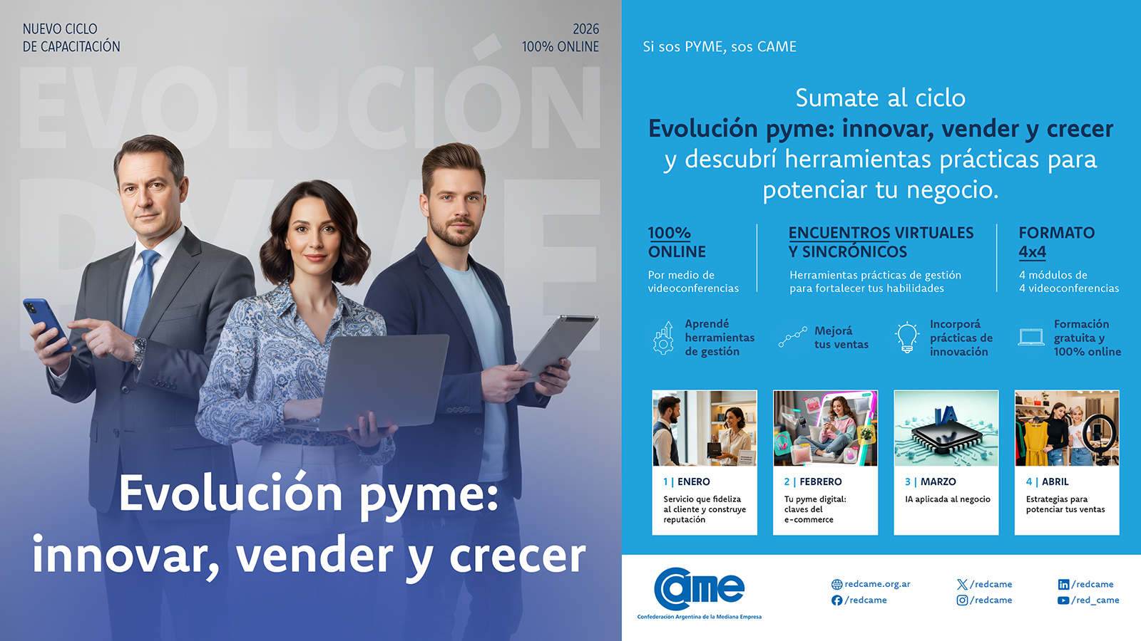 La Confederación Argentina de la Mediana Empresa (CAME), a través de su Escuela de Negocios, invita a empresarios y emprendedores de su red federal a sumarse al Ciclo de Capacitación Evolución pyme: innovar, vender y crecer, una iniciativa formativa, virtual, sincrónica y gratuita que se extenderá de enero a abril de 2026.